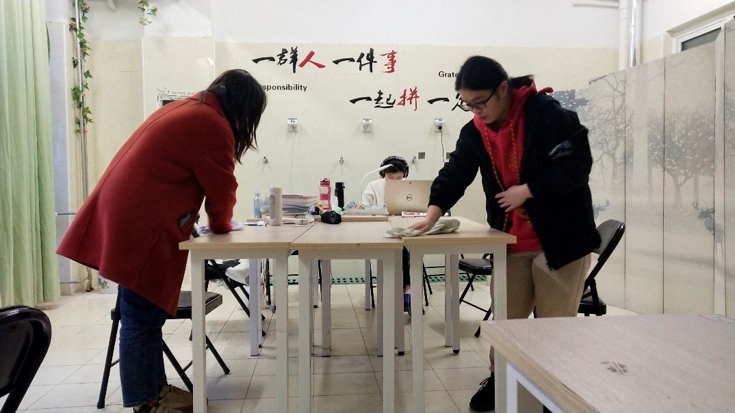 在團(tuán)支書趙清宇的組織下,12位同學(xué)分為4組,每組3人,分別負(fù)責(zé)從文書院A座的2—5層的活動(dòng)室和洗衣房,擦桌子掃地等不同分工井井有條,大家互相配合,相互合作,不放過每一個(gè)角落,為從文書院的同學(xué)們營造干凈整潔的生活和學(xué)習(xí)環(huán)境。
