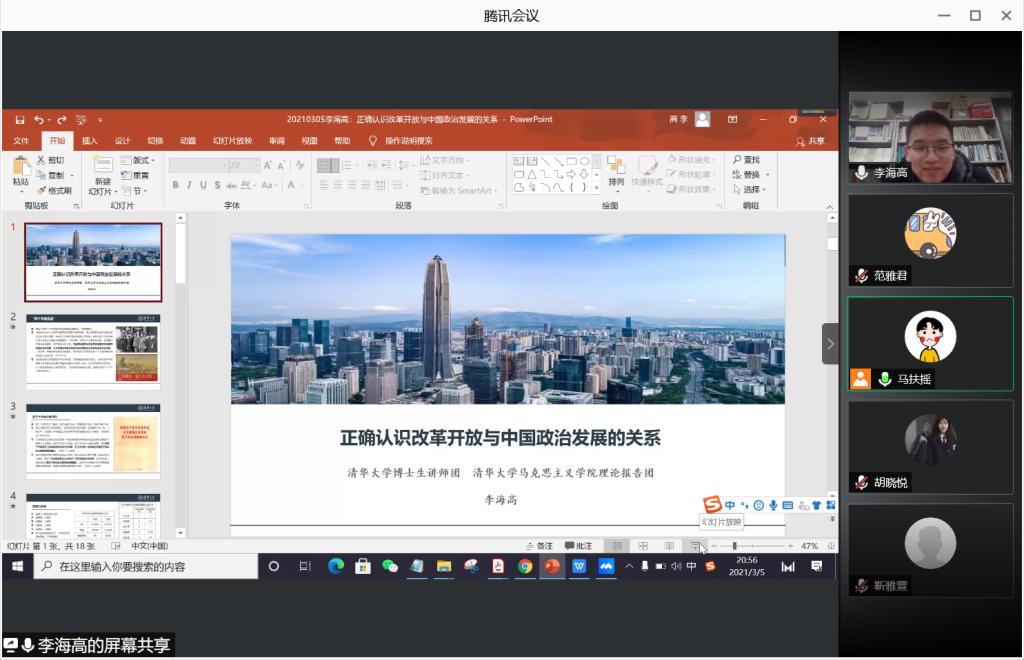 2021年3月5日晚,系列黨課第一期如期開講。本節(jié)黨課有幸邀請(qǐng)到清華大學(xué)博士生講師團(tuán)講師、清華大學(xué)馬克思主義學(xué)院博士生(黨的建設(shè)方向)李海高同志作為主講嘉賓進(jìn)行授課。他以 “正確認(rèn)識(shí)改革開放和中國(guó)政治發(fā)展的關(guān)系”為題進(jìn)行了精彩的講述,并在課后與支部同學(xué)進(jìn)行了互動(dòng)交流。按照疫情防控的有關(guān)要求,本次活動(dòng)采取騰訊會(huì)議方式進(jìn)行,法學(xué)院2019級(jí)碩士生三個(gè)黨支部共同參加了本次活動(dòng)。整期活動(dòng)進(jìn)展順利,取得了良好效果。