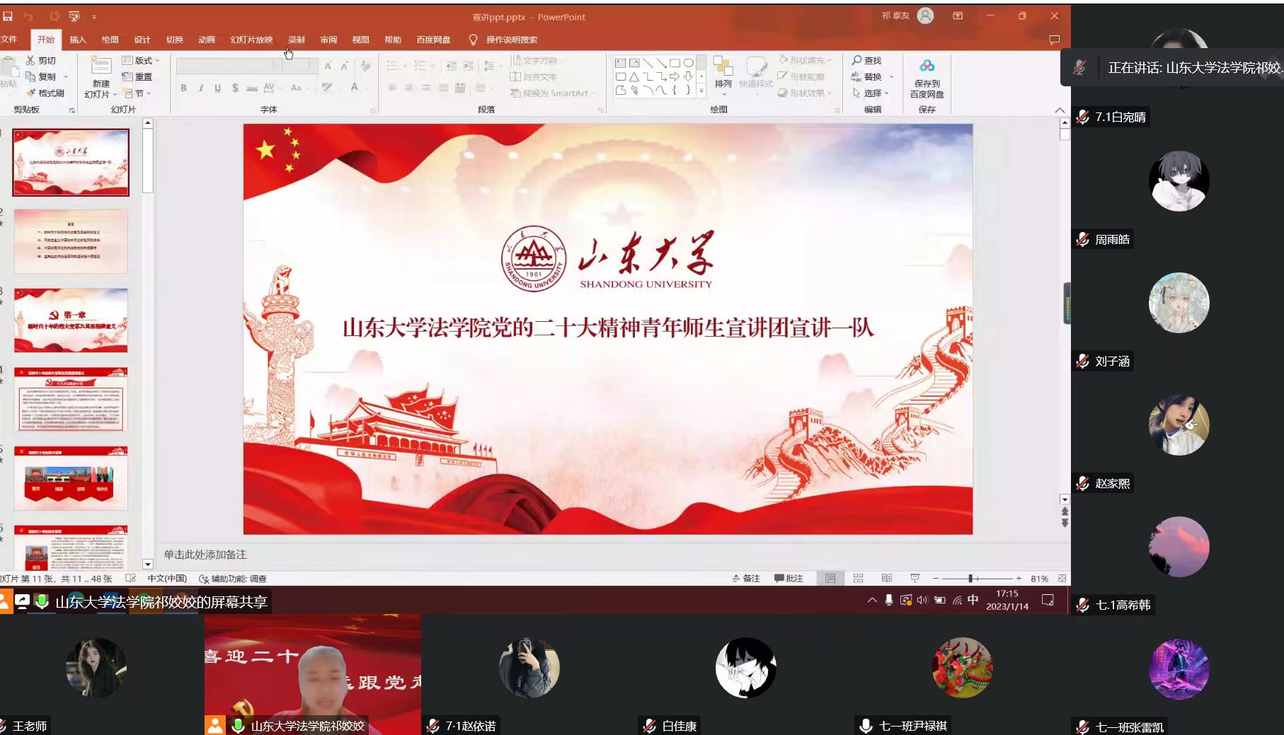 2023年1月14日,山東大學(xué)法學(xué)院黨的二十大精神青年師生宣講團宣講一隊面向河南省長垣市趙堤鎮(zhèn)華龍學(xué)校七年級一班30余名同學(xué)開展了一場線上專題宣講。此次宣講由該班班主任韓老師主持,山東大學(xué)法學(xué)院2022級研究生祁姣姣進(jìn)行了宣講。